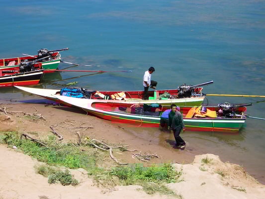 Wir überqueren die Grenze von Laos im Norden von Stung Treng. Nach der Ausreise aus Laos müssen wir vor der Weiterfahrt mit dem Boot zuerst zur Zollstation, die am gegenüberliegenden Ufer liegt. Eigentlich wollen wir mit dem Slow Boat von Voen Kham nach Stung Treng, doch aus für uns unerklärlichen Gründen soll es derzeit keine Slow Boats für Touristen geben. Stattdessen warten lärmige, kleine und für kambodschanische Verhältnisse teuere Schnellboote auf uns, die Fahrt kostet pro Person 10 US-Dollar (im Verhältnis zum Kambodschanischen Durchschnittseinkommens von monatlich 24 US-Dollar ein Vermögen). Nach mehreren Stunden ergebnislosem Warten auf ein Slow Boat, es soll eines flussaufwärts unterwegs sein, quetschen wir uns schliesslich doch noch in ein derartiges Schnellboot. Gegen einige der begehrten Dollars erhalten wir am Zoll auch die notwendigen Einreisestempel. Dann geht es los: Mit lautem Getöse rasen wir auf dem Mekong Richtung Stung Treng. Wir können immer noch nicht begreifen, dass wir uns jetzt in einem dieser ungeliebten Schnellboote befinden. Viel lieber würden wir gemütlich auf einem langsamen Boot flussabwärts tuckern. Die zweistündige Fahrt führt teilweise durch recht seichtes Wasser. An einem Ort müssen wir sogar aussteigen und zu Fuss eine Halbinsel durchqueren. Es ist ein lustiges Schauspiel, das sich hier präsentiert: Ein paar Touristen durchqueren in Einerkolonne die trockenen Reisfelder und alle sind mit Schwimmweste ausgerüstet. Landschaftlich ist die Fahrt sehr abwechslungsreich, karges Gebiet wechselt sich mit sehr fruchtbaren Regionen ab. Wir sind schliesslich froh, heil in Stung Treng anzukommen. Kaum aus dem Boot ausgestiegen, werden wir von jungen Kambodschanern umzingelt. Sie wollen uns alle in ein Guesthouse führen, natürlich jeder in sein eigenes. Wir gehen jedoch direkt weiter nach Ban Lung, in der Provinz Ratanakiri. Diese abenteuerliche Fahrt werden wir nicht so schnell vergessen: Sieben erwachsene Personen in einem normalen PKW unterwegs auf der unebenen, mit Löchern übersäten Staubstrasse. Nachdem wir vier Stunden durchgeschüttelt wurden, kommt in Ban Lung die nächste Überraschung: Für vier Touristen gibt es gerade noch ein freies Hotelzimmer. In den Augen unseres Taxichauffeurs ist dies zudem kein richtiges Hotel. Wir steigen hier trotzdem ab und merken erst später, dass hier die Hotelzimmer pro Stunde bezahlt werden. Wir teilen das Zimmer mit dem im PKW mitreisenden Ehepaar aus Kanada.