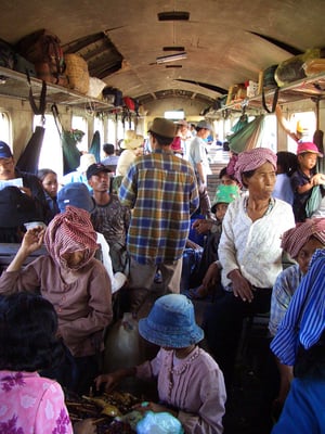 Von Phnom Penh aus verkehrt an ungeraden Kalendertagen jeweils ein Personenzug nach Battambang, an geraden Tagen fährt er die gleiche Strecke zurück. Um 6.25 h verlassen wir im Zug den Bahnhof von Phnom Penh, nach 13 Stunden oder 290 km kommen wir in Battambang an. Im Gegensatz zu unserer ersten Zugsreise in Kambodscha (siehe Spezialbericht "Mit dem Dschungelzug unterwegs"), genießen wir jetzt den Komfort von Holzbänken. Die Zugskomposition besteht aus 3 Personenwagen. Der Zustand der Sitzgelegenheiten ist unterschiedlich: zerbrochene und wackelnde Bänke sowie verrostete Stützlehnen sind an der Mehrzahl. Die Bodenlatten sind aufgerissen und in den Ritzen und Löchern tummeln sich zwischen Abfällen und Schmutz viele Käfer. Die Fensterscheiben fehlen, was die natürliche Belüftung begünstigt. Der Zug ist bis auf den letzten Platz gefüllt. Wie vielfach in Asien fahren einige Passagiere auf den Dächern der Waggons mit. Der Zug ist ein Tummelplatz für Händler. Es werden verschiedene Esswaren angeboten und die Kambodschaner scheinen während der ganzen Zugsfahrt hungrig zu sein. Ab und zu hält der Zug in abgelegenen Dörfern. Dort scheint niemand die tägliche Zugsdurchfahrt verpassen zu wollen. Zwischen den Stationen durchqueren wir Karstgebirge, flache Regionen mit Gemüseanbau sowie viele verschiedene Palmplantagen.
