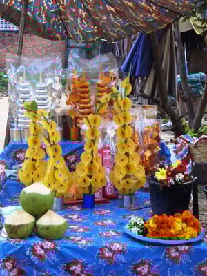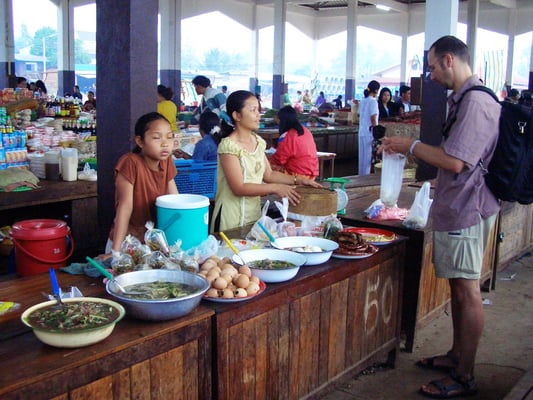 Frühmorgens, die Laoten stehen immer kurz vor Sonnenaufgang auf, machen wir unsere geliebten Marktrundgänge. Es herrscht bereits ein emsiges Treiben und die Käufer feilschen um die Ware. Frisches Gemüse, Früchte, Gewürze und Fleisch stehen im Angebot. Die Garküchen sind bereits offen und der Duft von frischen Nudelsuppen lässt uns das Wasser im Mund zusammenlaufen. Wir halten uns an die laotische Essgewohnheit und ziehen eine Suppe einem europäischen Frühstück mit Spiegelei und Toast vor. Bei einer älteren Frau verhandeln wir über einen Bund von etwa 20 Bananen. Wir sind überrascht, als wir für den ausgehandelten Preis anstelle eines Bundes deren zwei erhalten. An der Mimik der Frau merken wir, dass wir sehrwahrscheinlich immer noch zuviel für die Bananen bezahlt haben. Unser Bedarf an Bananen ist nach diesem Einkauf für die nächsten Tage mehr als gedeckt. Wer Spass am Handeln und Feilschen hat, kommt auf den Märkten immer auf seine Kosten. Es gibt dort keine festen Preise. Grosse Preisnachlässe sind allerdings selten zu erzielen, da die meisten Händler nicht, ausser in Touristenzentren wie Luang Prabang, Ausländern gegenüber mit Fantasiepreisen aufwarten.