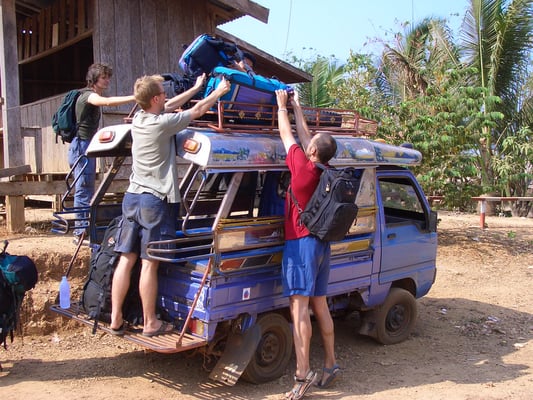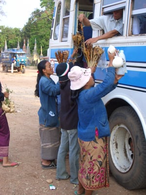 Von Luang Prabang fahren wir mit dem Bus Richtung Osten. Unser Ziel ist die Ebene der Tonkrüge. Die Strecke nach Phonsavan, der Hauptstadt der Provinz Xieng Khouang, führt über spektakuläre Passstrassen. Die gut ausgebaute Strasse folgt meist den steilen, mit Regenwald bedeckten Bergkämmen. Nur selten führt sie hinunter ins Tal, um einen Fluss zu überqueren. Wie üblich in Laos ist der Bus bis auf den letzten Platz gefüllt. Mehr sogar, im Gang stapeln sich Reissäcke oder in Getreidesäcke eingepackte Hühner. Einer der Mitreisenden führt sogar einen frisch geschlachteten Büffelschädel mitsamt Hoerner mit. Der intensive Verwesungsgeschmack bleibt auch nach dem Aussteigen des Bauern in unseren Nasen. Die laotischen Busse sind übrigens mit natürlicher Air-Condition ausgestattet: Die Fensterscheiben bleiben während der Fahrt meistens weit geöffnet. Dies hat mehrere Vorteile: Der Bus wird immer durchgelüftet; im Bus stauen sich keine Abfälle und sofern der Magen streikt, kann dessen Inhalt direkt durchs Fenster entsorgt werden.
