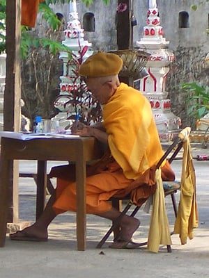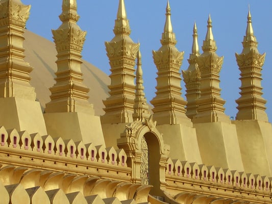 Nach zwei Wochen in Laos erreichen wir die Hauptstadt Vientiane. Im Vergleich zu anderen asiatischen Hauptstädte befindet sich Vientiane noch im Tiefschlaf. Alles wirkt ruhig und eher provinziell. Als Sehenswürdigkeiten sind der Patou Saz, ein gewaltiger Triumphbogen, dem l'Arc de Triomphe in Paris nicht unähnlich, und der Trath Luang, das Wahrzeichen von Laos, zu nennen. Während der Besichtigung des Trat Luang, einer 30 Meter hohen goldverzierten Stupa, werden wir durch laute Musik und Gesang auf einen Anlass im angrenzenden Tempel aufmerksam gemacht. Dort finden die Feierlichkeiten zur Mönchsweihe statt. Zwei vom Novizen zum Mönch aufgestiegene Männer werden auf Betten von ihren Familien und Freunden mehrmals um den Tempel getragen. Dazu wird auf lokalen Musikinstrumenten gespielt, es werden Lieder gesungen und die Männer trinken dazu ausgiebig Lao-Lao, den laotischen Reisschnaps. Es herrscht ein freudiges, lautes und emsiges Treiben. Für alle Beteiligten und im besonderen für die neuen Mönche sind diese Feierlichkeiten und der definitive Eintritt ins Kloster von grosser Wichtigkeit.