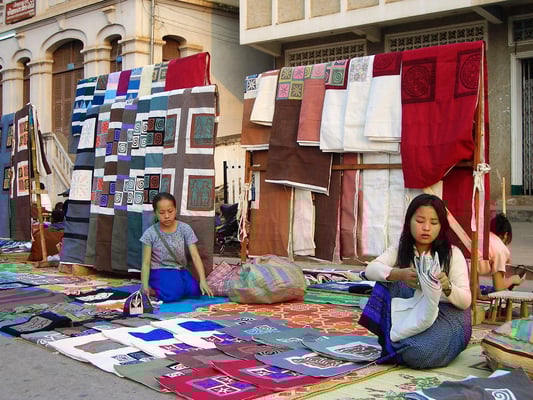 Nach Einbruch der Dunkelheit verwandelt sich die Hauptstrasse in Luang Prabang in einen Markt, auf welchem lokale Handarbeiten angeboten werden. Die Ware wird auf Bambusmatten ausgebreitet und im Schein von kleinen Glühbirnen werden wunderschöne Patch-Work Decken und Bettanzüge, Seidenkleider, Stoffhosen und -Blousen, Lampen und viele andere Souvenirs verkauft. Die Touristen sind sehr ausgabefreudig und häufig wissen die Verkäufer gar nicht, wie hoch sie die Preise ansetzen wollen. Es ist schade, dass die meisten Touristen das Feilschen um den richtigen Preis verlernt oder gar nie gekannt haben.