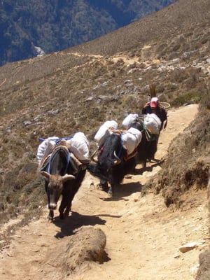 Auf unseren taeglichen Etappen talaufwaerts begegnen wir schwer beladenen Traegern, die Lasten von bis zu 100 Kilogramm auf ihren Ruecken schleppen. Auch Yaks werden als Lastentiere eingesetzt. So wird der Nachschub an Getraenken und Nahrungsmitteln, aber auch die Ausruestungen von Expeditionen ins Mt. Everest Basislager, in die Lodges und Shops hochgetragen. Viele Touristen ueberlassen, im Gegensatz zu uns, ihr schweres Gepaeck einem Traeger und sind nur mit einem kleinen Tagesrucksack unterwegs.