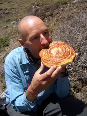In Manang, auf 3570 Meter ueber Meer, machen wir eine unerwartete Entdeckung: Das Angebot der Tilicho Baeckerei laesst uns das Wasser im Munde zusammenlaufen: Schokoladegipfel, Zimtnussschnecken so gross wie Suppenteller, Apfelstrudel und weitere Suessigkeiten liegen im Schaufenster. Wir koennen nicht widerstehen und goennen uns ein feines Znueni. Dazu trinken wir ein Glas "Seabuckthron"-Saft. Diese Frucht wird hier angepflanzt und ihr Vitamingehalt soll sehr hoch sein.