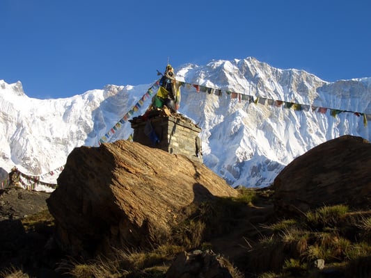 Ueber die Anhoehe von Deorali gelangen wir schliesslich ins Tal des Modi Khola. Wir folgen dem Fluss talaufwaerts und erreichen die Berghuetten des Annapurna Basislagers auf 4130 Meter ueber Meer. Nachdem wir waehrend 18 Tagen das Annapurna-Massiv zu Fuss umrundet haben, sind wir nun ins Zentrum dieser Bergarena vorgestossen. Bei Sonnenaufgang praesentiert sich uns ein wolkenfreies, grandioses 360 Grad Panorama. Wir sehen die Gipfel des Annapurna I (8091 Meter), Gangapurna (7454 Meter), Annapurna III (7555 Meter), Machhaputchhare (6997 Meter) und des Hiunchuli (6941 Meter). Nachdem wir vor wenigen Tagen noch geschwitzt haben, ist es hier oben recht kalt und unsere Thermowaesche kommt nochmals zum Einsatz. Wieso oft auf unserer Wanderung sind wir die einzigen Gaeste in unserer Lodge. Wir legen einen weiteren Ruhetag in dieser beeindruckenden Bergwelt ein. Zum letzten Mal lassen wir die Ruhe und die Nahe der Himalayagipfel auf uns einwirken.