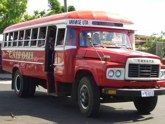 Das Herumreisen mit den öffentlichen Bussen ist ein spezielles Erlebnis. Auf den Holzbänken der farbigen Busse, mit Holzkarrosserie, finden 33 Fahrgäste Platz. So steht es zumindest auf einer Tafel neben dem Chauffeur. Doch wie so oft, wird schliesslich jeder Raum im Bus mit Fahrgästen gefüllt. Herannahende Busse sind schon von weitem zu hören: Laute Reggaemusik dröhnt aus den offenen Fenstern. Will man einsteigen, deutet man dies dem Buschauffeur mit Handzeichen an.