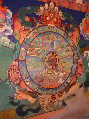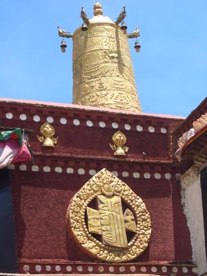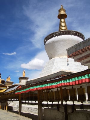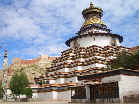 Ein weiteres sehenswertes Kloster befindet sich in Gyantse. Vom Dach des Pelkor Choede Monastery bietet sich eine Rundsicht auf die Stadt und die zerstoerte Burganlage, den Dzong.