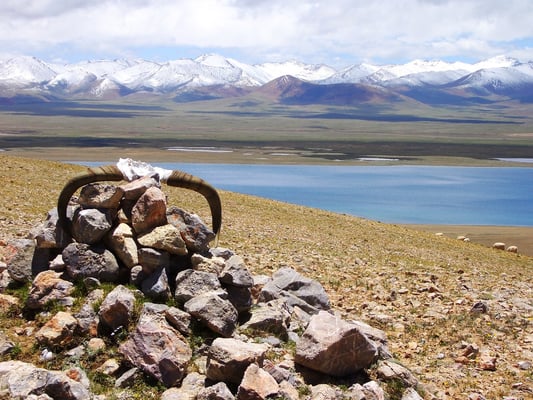 Bevor wir Tibet verlassen, fahren wir mit einem Jeep zum Namtso-See auf 4718 Meter ueber Meer. Der 70 Kilometer lange und 30 Kilometer breite Salzwasser-See liegt am Fusse der ueber 7000 Meter hohen Berggipfel der Nyenchen Tanglha-Gebirgskette. Diese Berge haben Heinrich Harrer und Peter Aufschneiter, beruehmt durch das Buch „Sieben Jahre in Tibet“, auf ihrer Flucht nach Lhasa ueberquert. Wir erklimmen einen Huegel und lassen die unendlich scheinende Weite des Hochlandes auf uns einwirken. In den gruenen Wiesen sehen wir grosse schwarze Punkte. Es sind die Zelte der Lhangtang-Nomaden.