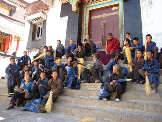 Auf der Rueckfahrt nach Lhasa machen wir einen Abstecher ins Rong-Chu-Tal zum Kloster von Reting. Dieses Kloster liegt idyllisch in einem grossen Foehrenwald. Die einst impossante Klosteranlage wurde von den Chinesen fast vollstaendig zerstoert. Heute sind ein paar wenige Moenche damit beschaeftigt, den Haupttempel zu renovieren. Die Renovationskosten traegt auch dieses Kloster alleine, da die chinesische Regierung keine finanzielle Hilfte leistet. Spontan helfen wir mit, einen schweren zehn Meter langen Holzbalken bergabwaerts zum Klostereingang zu ziehen. Die Moenche bedanken sich freundlich fuer unseren Einsatz.