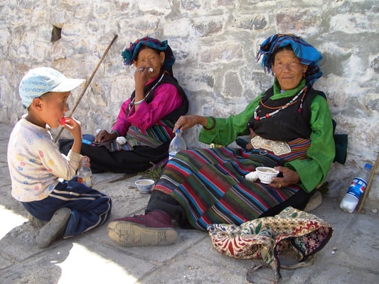 Die Tibeter lassen jene Lebensfreude, die wir sonst in Asien so haeufig angetroffen haben, vermissen. Stattdessen werden ihre meist traurigen, nachdenklichen Gesichter mit den ausdruckslosen Augen und die allgegenwaertigen bettelnden Gesten noch laengere Zeit in unseren Erinnerungen haften bleiben.