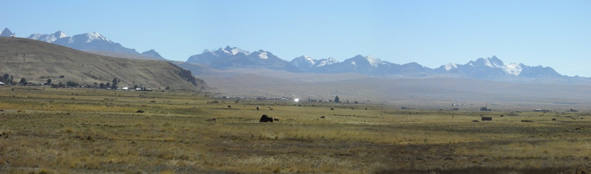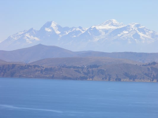 Tag 56, 75 km, 980 Hm, sonnig und warm, landschaftlich einer der schönsten Tage, Highlight: majestätisch in den Himmel ragende, schneebedeckte Bergketten und im Vordergrund der Titikaka-See